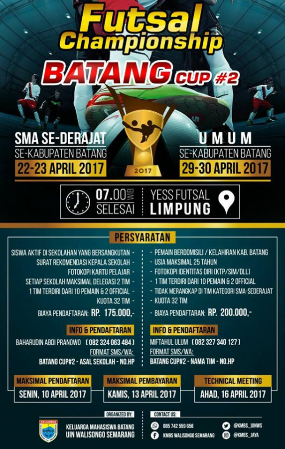 Dibuka pendaftaran untuk SLTA dan UMUM. Kuota masing-masing kategori : 32 tim.Daftarkan tim kalian dengan format sms :SLTA : BATANG CUP#2 - ASAL SEKOLAH - NO. HP. kirim ke 082324063488UMUM : BATANG CUP#2 - NAMA TIM - NO.HP. kirim ke 082327340127.Biaya pendaftaran :SLTA : 175.000/timUMUM : 200.000/ti