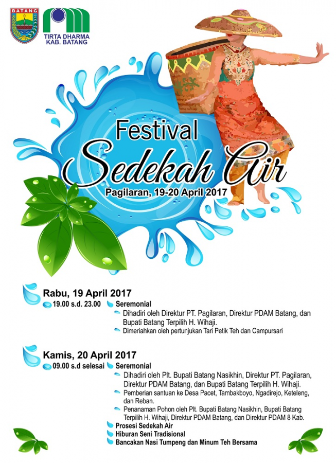 Dalam rangka HUT ke 24 PDAM Kabupaten Batang Tahun 2017, PDAM Batang dan Forum Komunikasi Pelanggan mengadakan Festival Sedekah Air.Acara ini dimaksudkan supaya kita menghargai air sebagai sumber kehidupan yang sangat kita butuhkan setiap hari. Kita harus bisa memanfaatkan dan menjaga air dengan seb