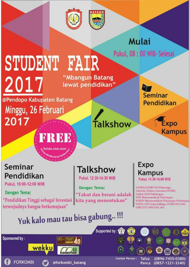 Ayo Ramaikan "STUDENT FAIR 2017 "Lingkari Kalender Minggu, 26 Februari 2017.Mulai pukul 08.00 - selesai. Acaranya ada Talkshow, Seminar Pendidikan, expo Campus.Cocok banget buat temen - temen SMA sederajat yg udah mau lulus dan berkeinginan untuk melanjutkan ke jenjang yg lebih tinggi, ada bany