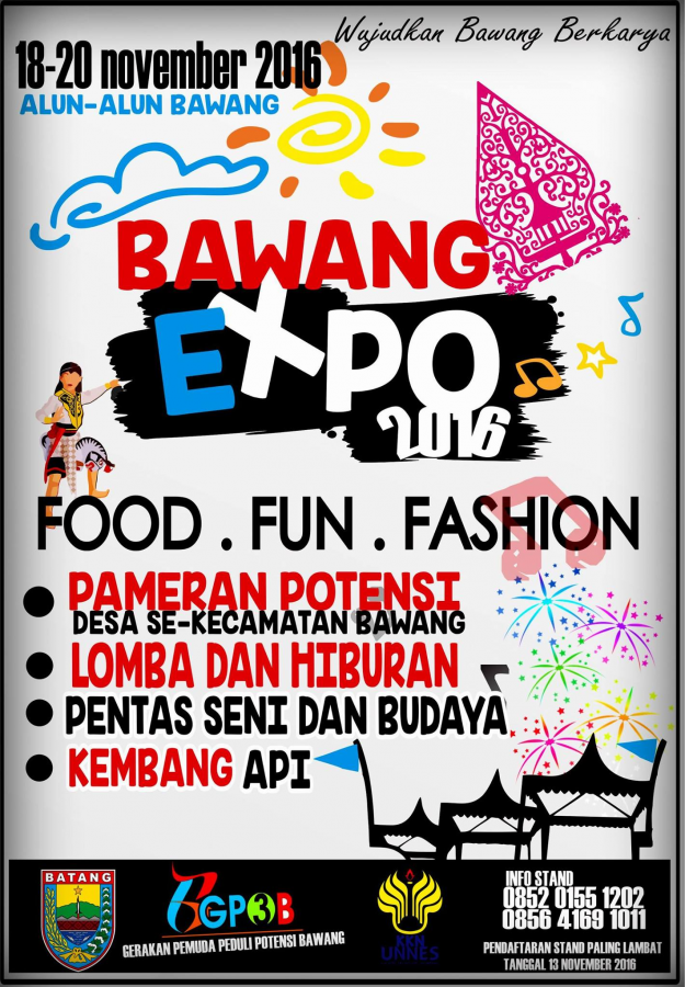 Salam Gass Potensi!!!Bawang Expo 2016 merupakan event pertama di Kec. Bawang yang menampilkan Potensi Kebudayaan, Kesenian dan Pariwisata dari 20 Desa se- Kecamatan Bawang serta UKM (Usaha Kecil dan Menengah) di Kecamatan Bawang.Diisi pula oleh aneka Hiburan :Pentas Kesenian Tradisional di Kec. Bawa