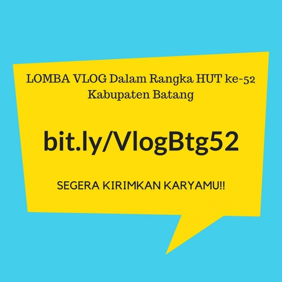 Tema: Pemanfaatan Vlog untuk Promosi Wisata BatangSub tema:Objek wisata di Kabupaten BatangKearifan lokal masyarakat BatangKesenian tradisional dalam VlogPersyaratan Lomba VLog :Peserta umum (perorangan/tim)Karya orisinilMasa unggah video mulai tanggal 6 s.d 31 Maret 2018Durasi video maksimal 3 meni
